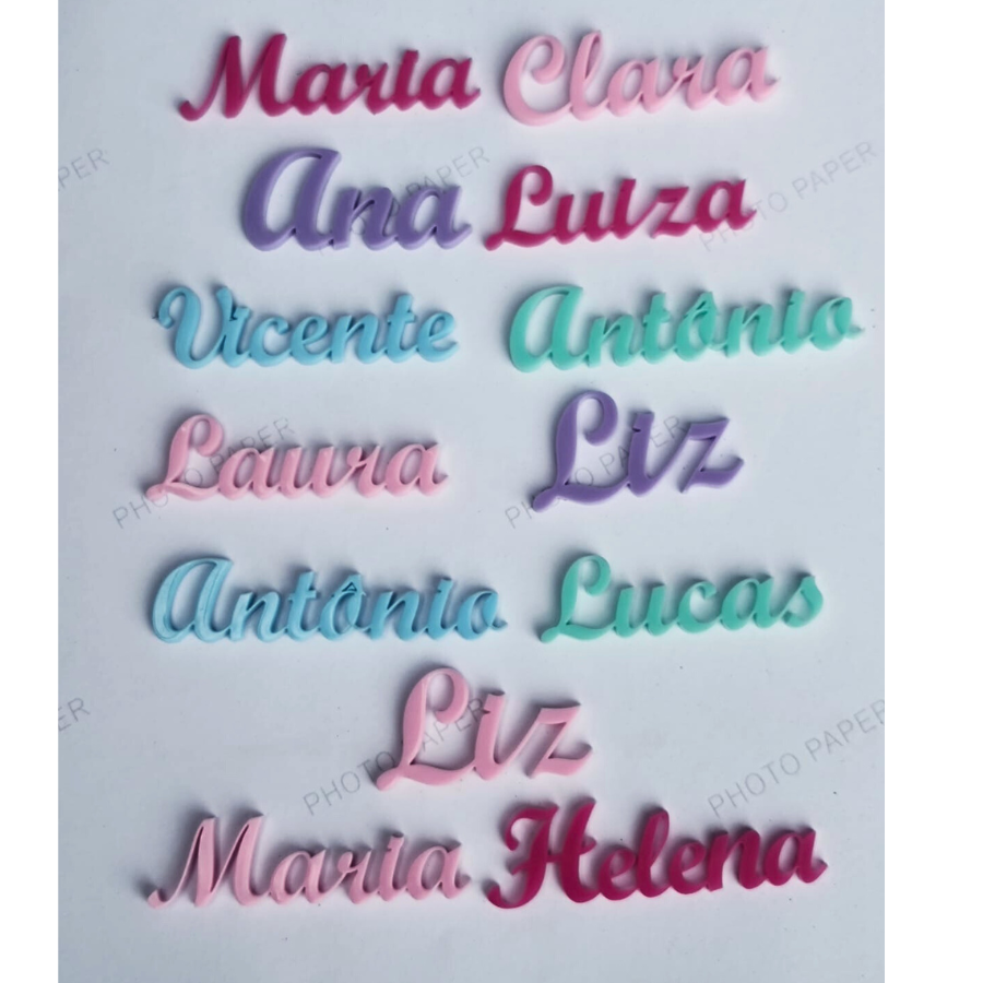 Kit com 10, 20 e 40 Nomes. As peças são produzidas com aproximadamente 5cm de comprimento por 2cm de altura. Essa varição ocorre para manter uma proporção dos nomes.